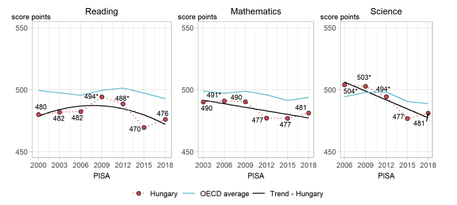 A legfrissebb PISA eredmények azt mutatják, hogy a magyar diákok teljesítménye elmarad az OECD átlagtól. Ennél is aggasztóbb, hogy a diákok a korábbi évekhez képest is rosszabbul teljesítenek. Például míg 2006-ban és 2009-ben a magyar diákok az OECD átlag felett teljesítettek a természettudományok területén, 2018-ban már az OECD átlag alatt. Az 1. ábrán jól látszik, hogy a szövegértés és matematika eredmények is jelentősen romlanak. Ha ilyen mértékben romlik a közoktatás minősége, akkor hogyan szorulhat háttérbe az oktatásfejlesztés, és mit lehet tenni, hogy a helyzet javuljon?