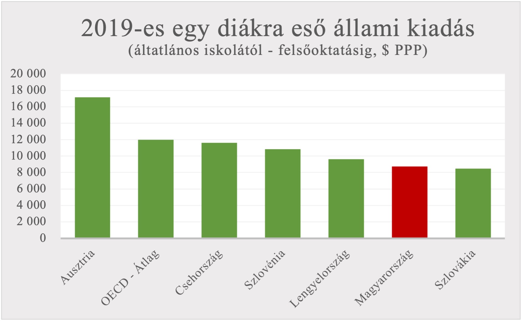 Folyamatos vita tárgya, hogy mitől és hogyan lehet jól működő egy közoktatási rendszer. A valóságban az egymástól sok tekintetben eltérő módon felépülő oktatási rendszerek képesek hasonló eredményeket produkálni. Vitathatatlan azonban, hogy az összes jól működő oktatási rendszer drága. Az erőforráshiánytól szenvedő oktatási rendszerek ezért mindig gyengébben teljesítenek. Márpedig Magyarországon az egy diákra eső állami kiadás az egyik legalacsonyabb az OECD-ben (lásd a 2. ábrát), a magyar tanárok fizetése pedig csupán 60%-a az OECD átlag diplomás fizetéseinek. Ennek ellenére a magyar tanárok tanítási óráinak a száma nem marad el az uniós átlagtól, sőt, gyakran másodállásra kényszerülnek. A pedagógusi pályát elhagyókat pedig nincs, aki helyettesítse. A fáradt és alulfizetett tanárok, a romló iskolai infrastruktúra, az omladozó falak, a WC-papír- és krétahiány mind negatívan hatnak a közoktatás minőségére. Nem csoda, hogy ilyen erőforráshiányos környezetben a diákok teljesítménye az utóbbi években folyamatosan romlik. (Tegyük hozzá, hogy a csökkenő erőforrásokat is igazságtalanul osztja el a kormányzat. Lásd például az oktatási hivatal bőkezű finanszírozását és a propagandisztikus és kontrafaktuális tananyagok legyártatását.)