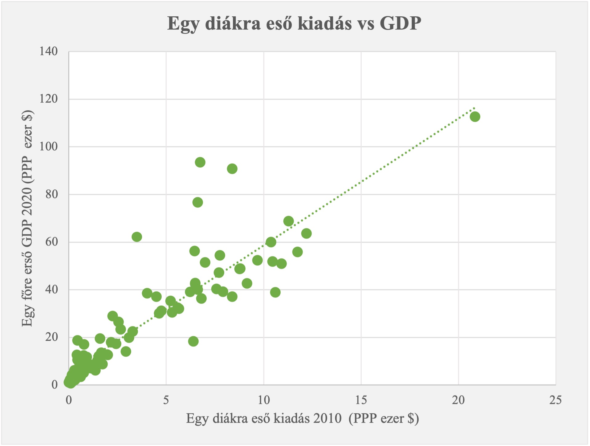 A rossz minőségű közoktatás növeli a társadalmi különbségeket, csökkenti az alsóbb rétegek felzárkózási lehetőségeit és az ország gazdasági versenyképességét. Az oktatásfejlesztésre odafigyelő országokban az egy főre jutó GDP jellemzően magasabb: a 3. ábrán a zöld pontok mindegyike egy-egy ország 2020-as GDP-jét és tíz évvel korábbi, egy diákra jutó oktatási kiadását mutatja. Jól látható, hogy azok az államok, melyek a múltban sokat költöttek az oktatásra, 2020-ban jellemzően magas GDP-vel rendelkeztek. Persze az ábrából egyértelmű ok-okozati összefüggés nem olvasható ki, ugyanis nem lehet tudni, hogy azért magas az egy diákra jutó állami kiadás, mert az egyébként erőforrásokban gazdag országban volt miből költeni az oktatásra is, vagy azért magas a GDP, mert az állam kifejezetten a közoktatásra fordított sok költségvetési pénzt. Ezzel együtt is logikusnak tűnik a következtetés, hogy az oktatásfejlesztés gazdasági növekedéssel jár. Egy 2018-as tanulmány, amely kifejezetten a közép- és kelet-európai gazdaságokat hasonlította össze, kimutatta, hogy az oktatásra szánt kiadások növelése hosszútávon pozitívan hat a gazdaságra.